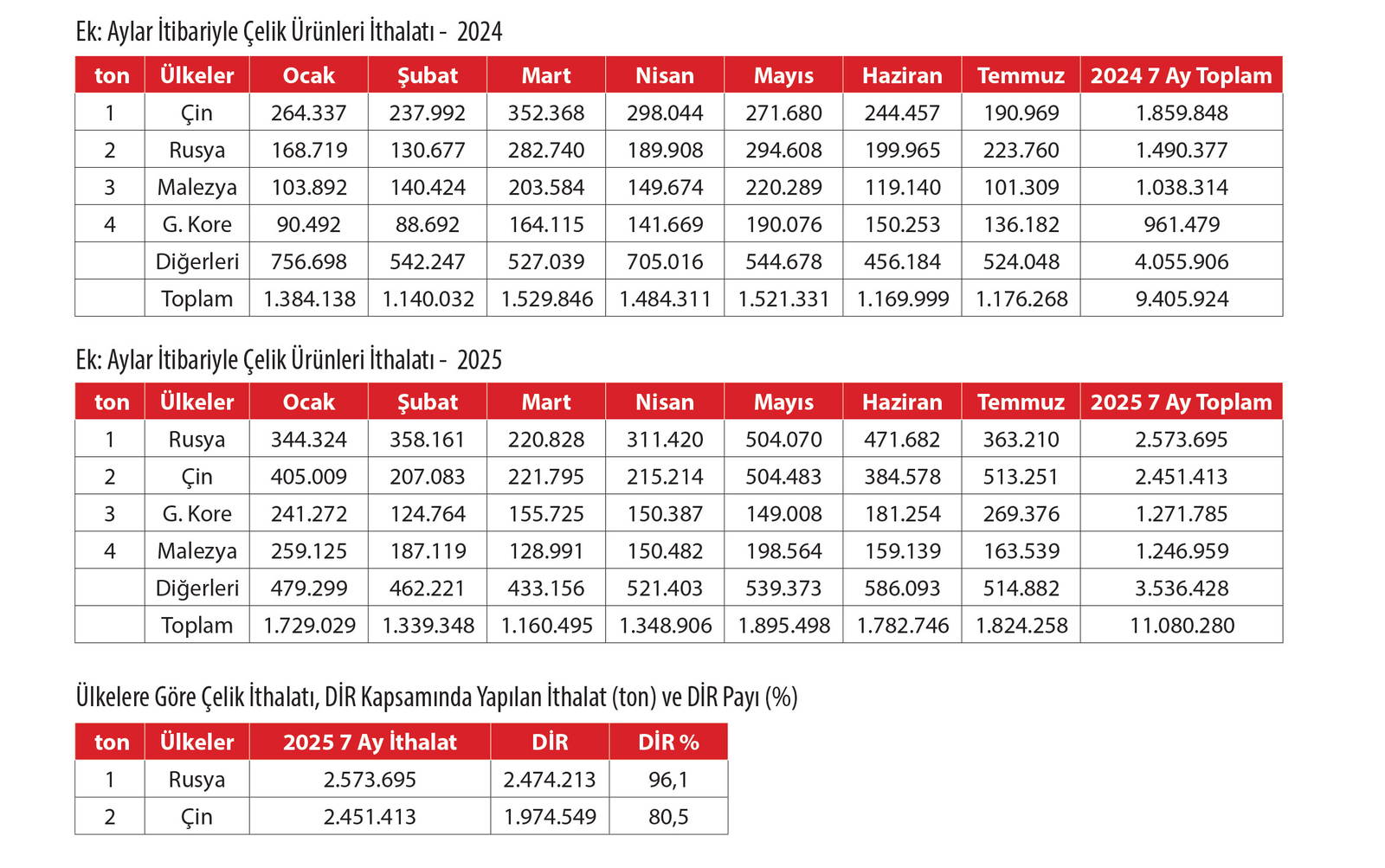 2025 yılında ise, 2024 yılında filmaşin için alınan korunma tedbiri ve Ekim ayında sıcak yassı ürünler için karara bağlanan damping vergileri sebebiyle ithalatta düşüş beklenirken, başlangıçta kısa bir düşüş yaşansa da, yılın ikinci çeyreğinden itibaren yeniden artış eğilimi ortaya çıkmıştır.