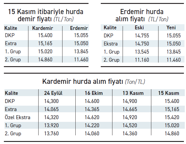 Kardemir DKP kalite hurdanın tonunu 15 bin 400 liradan, Erdemir’de 15 bin 55 liradan alacak. Eylül ve Ekim’de birer, Kasım’da da iki defa olmak üzere 2 ayda dört kez fiyat artırımına giden Kardemir hurda alım fiyatlarına ton başı 1100 lira zam yaptı. Son 2 ayda hurda demir alım fiyatında yaklaşık yüzde 8 artış yapan Kardemir 24 Eylül’de tonu 14 bin 300 liradan aldığı DKP kalite için 15 Kasım’da 15 bin 400 lira alım fiyatı açıkladı. Kardemir, 24 Eylül’de 14 bin 300 lira olan DKP kalite hurda tonunu 15 Kasım itibari ile 15 bin 400 liradan, 14 bin 65 lira olan Ekstra hurdanın tonunu 15 bin 165 liraya, 13 bin 920 lira olan 1. Grup hurdanın tonunu da 15 bin 20 liradan alacak.