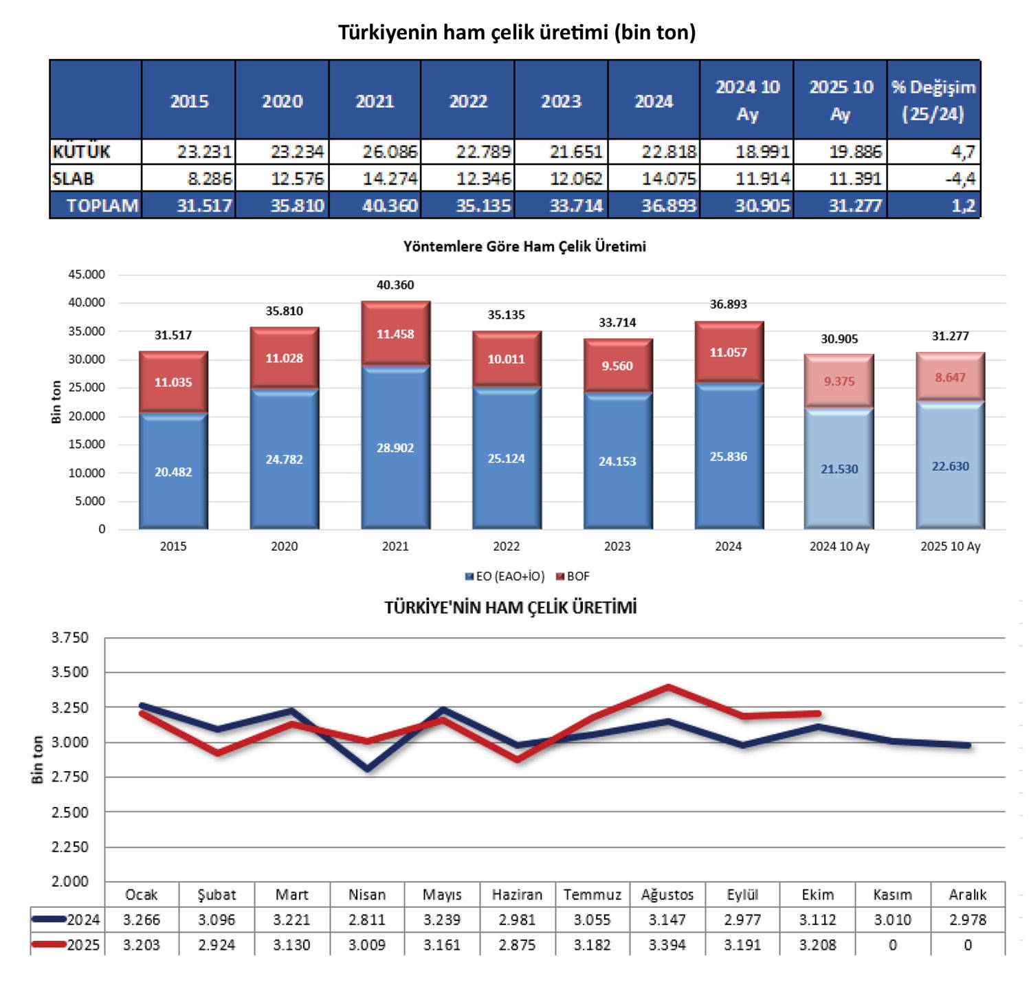 2025 yılının Ekim ayında Türkiye’nin ham çelik üretimi, geçen yılın aynı ayına göre %3,1 artışla, 3,21 milyon tona yükseldi. Kütük üretimi %9,2 oranında artışla 2,07 milyon ton, slab üretimi %6,5 oranında azalışla 1,1 milyon ton oldu. Bu veriler ışığında, 10 aylık dönemde ham çelik üretimi, geçen yılın aynı dönemine kıyasla %1,2 artışla 31,3 milyon ton oldu. Kütük üretimi %4,7 artarken, slab üretimi %4,4 azalış kaydetti.